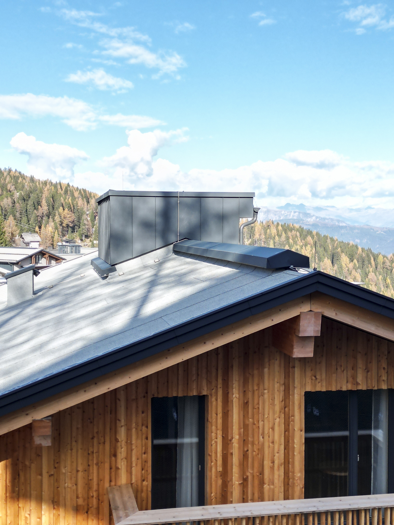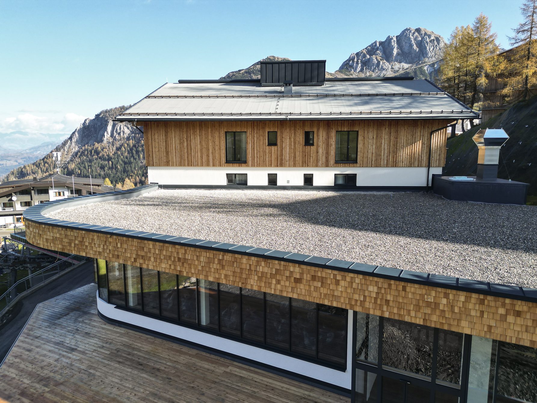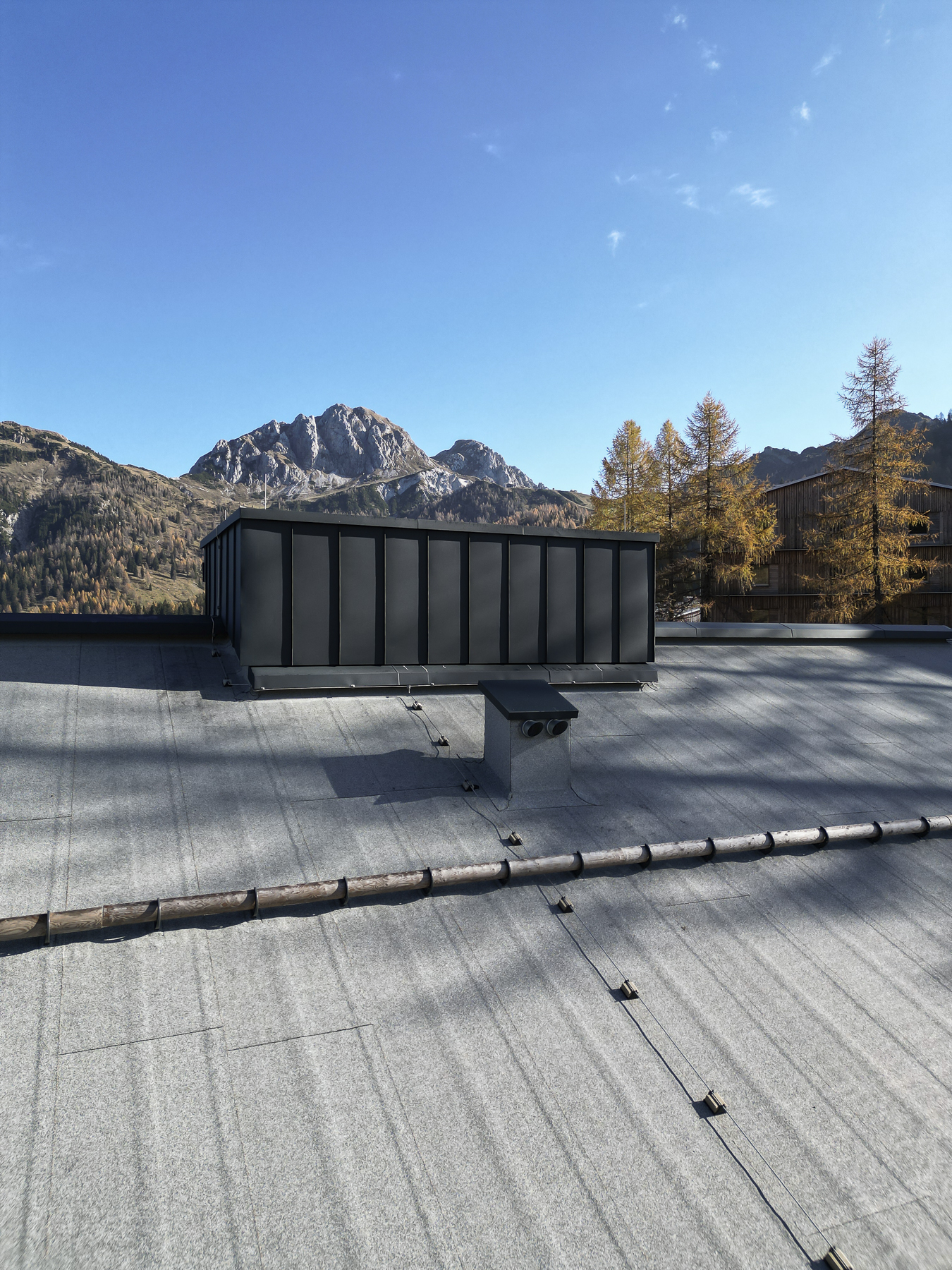 Das Steildach des Hauptgebäudes haben wir mit dem widerstandsfähigen Villas Alpin Dichtdach eingedeckt, das sich besonders durch seine Stabilität in schneereichen Regionen auszeichnet. Gerade am Nassfeld, das für seine schneereichen Winter bekannt ist, war diese Lösung ideal, um auch extremen Witterungsbedingungen dauerhaft standzuhalten. Für die 1.000 Quadratmeter Flachdächer kam eine Bauder-Folie mit Warmdach-Konstruktion zum Einsatz, die wir anschließend bekiest haben. Einige der Flachdächer wie zum Beispiel die Vordächer, wurden mechanisch befestigt. Alle Spenglerarbeiten – von der Attika über die Fensterbänke bis hin zu den Dachrinnen – und sämtliche Abdichtungsarbeiten haben wir ebenfalls durchgeführt.