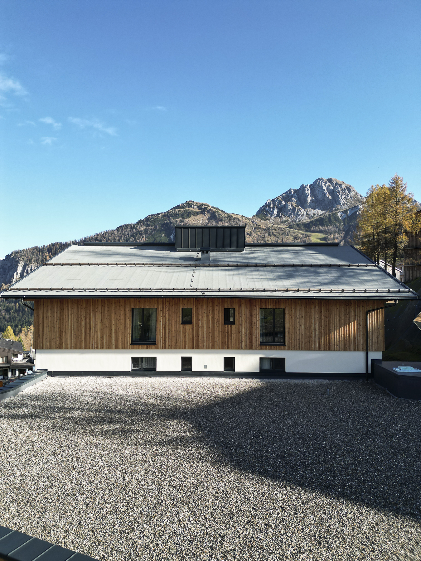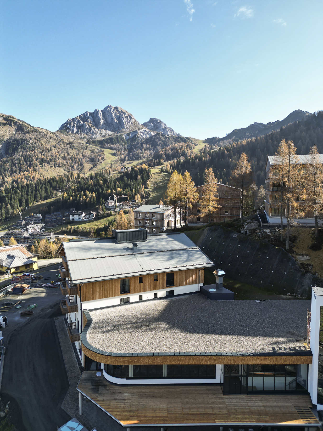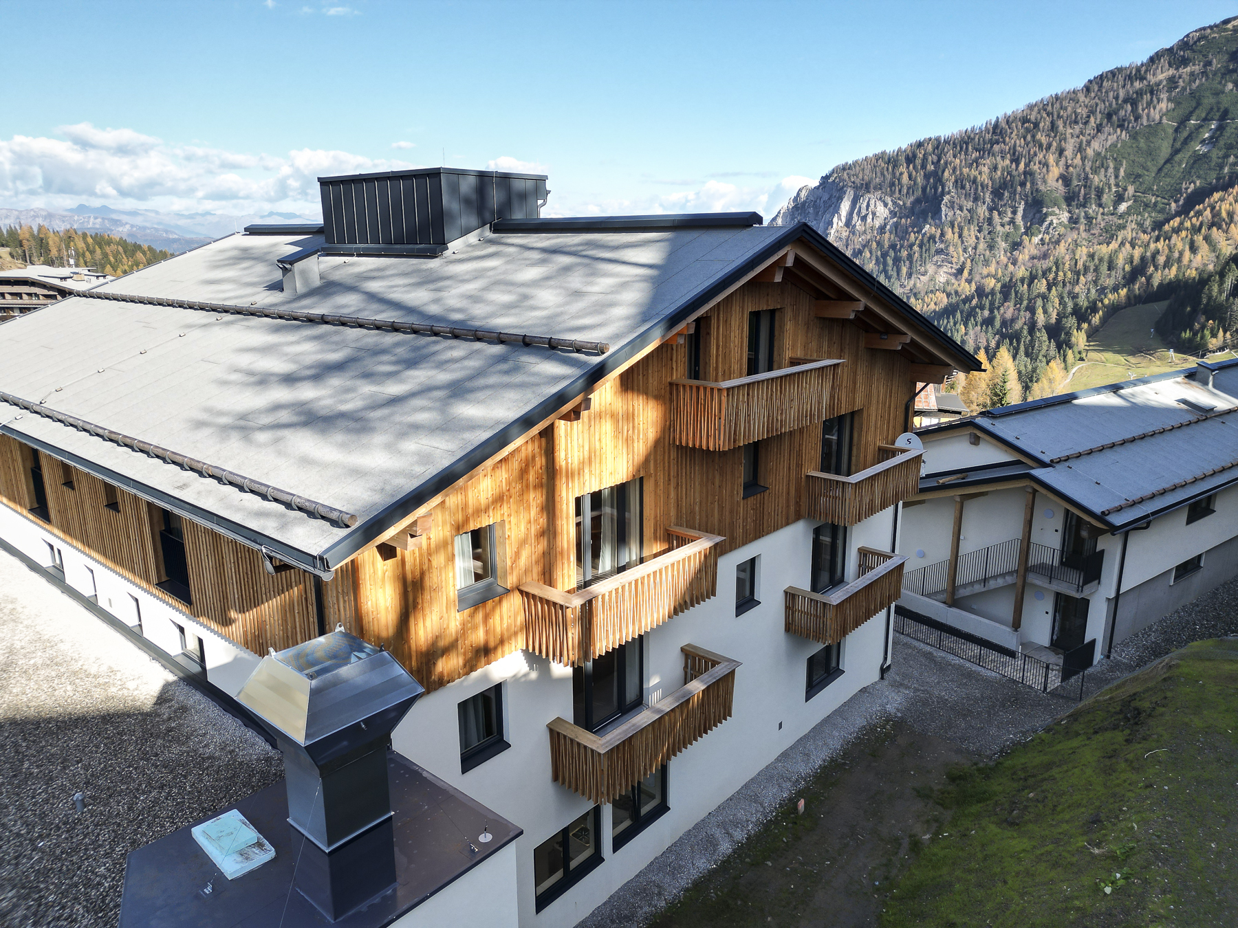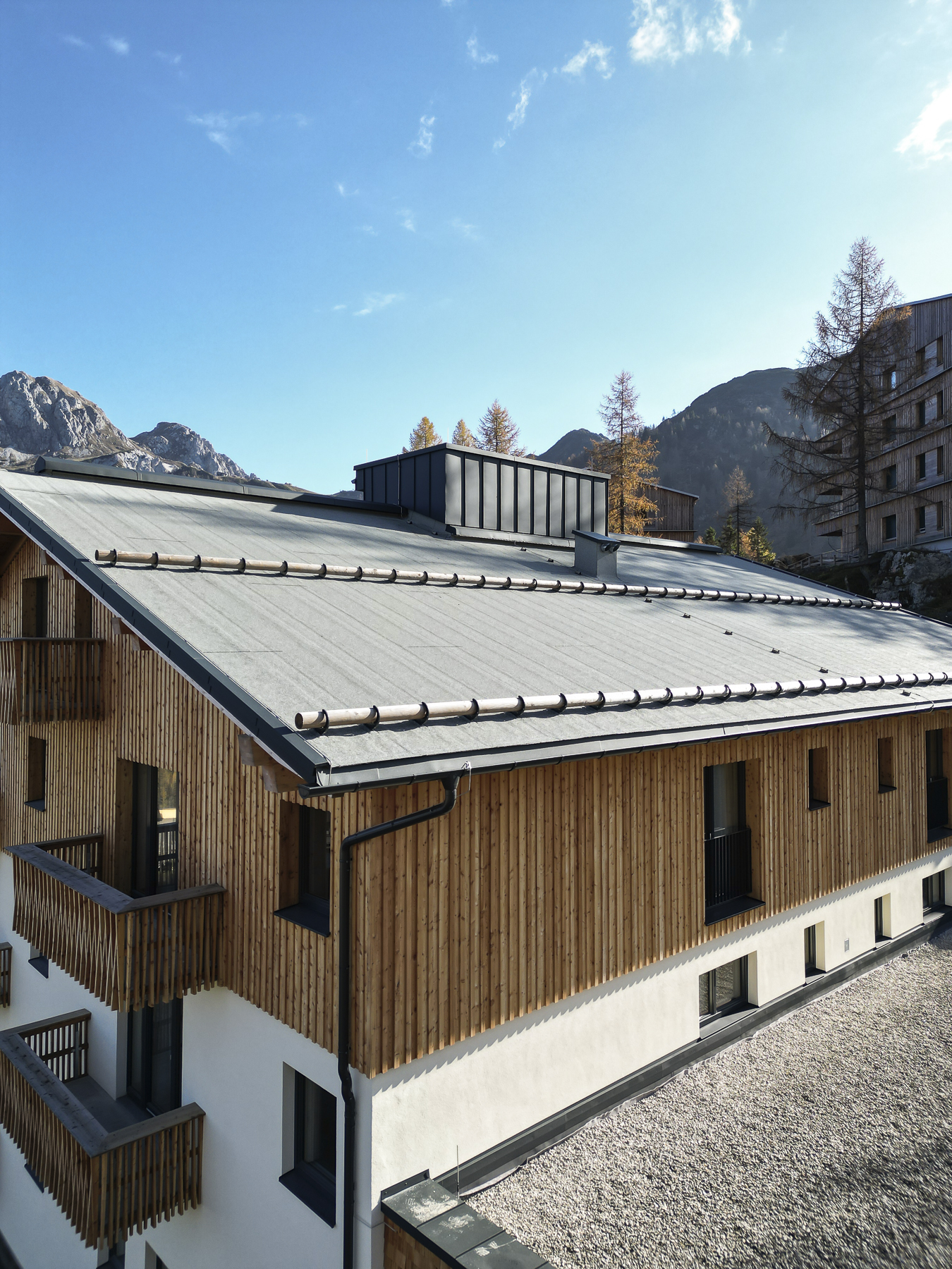 Das Steildach des Hauptgebäudes haben wir mit dem widerstandsfähigen Villas Alpin Dichtdach eingedeckt, das sich besonders durch seine Stabilität in schneereichen Regionen auszeichnet. Gerade am Nassfeld, das für seine schneereichen Winter bekannt ist, war diese Lösung ideal, um auch extremen Witterungsbedingungen dauerhaft standzuhalten. Für die 1.000 Quadratmeter Flachdächer kam eine Bauder-Folie mit Warmdach-Konstruktion zum Einsatz, die wir anschließend bekiest haben. Einige der Flachdächer wie zum Beispiel die Vordächer, wurden mechanisch befestigt. Alle Spenglerarbeiten – von der Attika über die Fensterbänke bis hin zu den Dachrinnen – und sämtliche Abdichtungsarbeiten haben wir ebenfalls durchgeführt.
