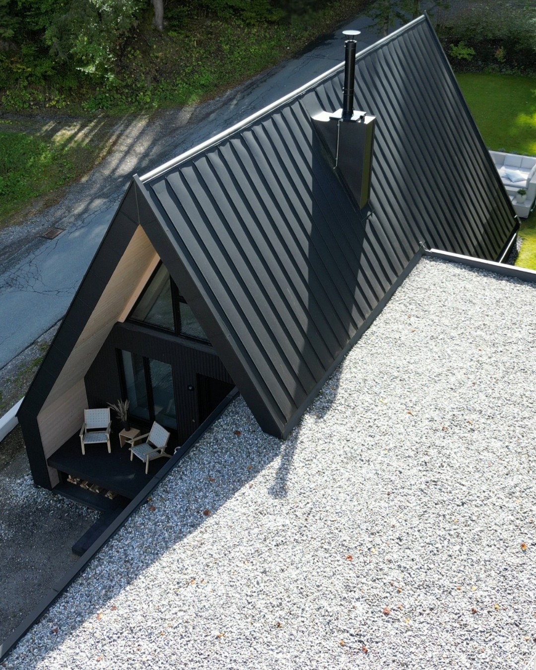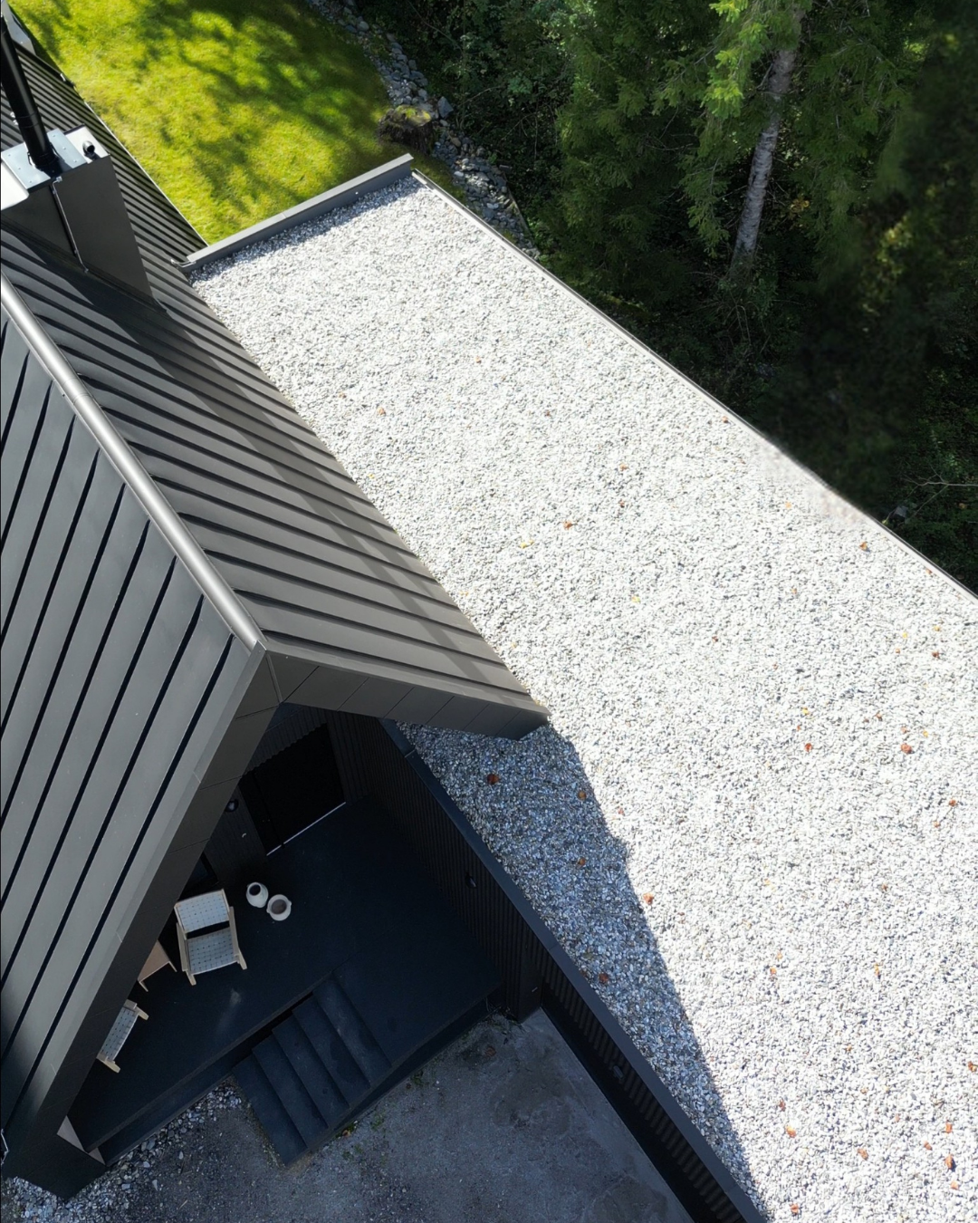 Das Flachdach wurde als klassisches Warmdach mit Abdichtungsfolie und Kiesauflage ausgeführt und bildet einen ruhigen Kontrast zur steilen Dachfläche.
