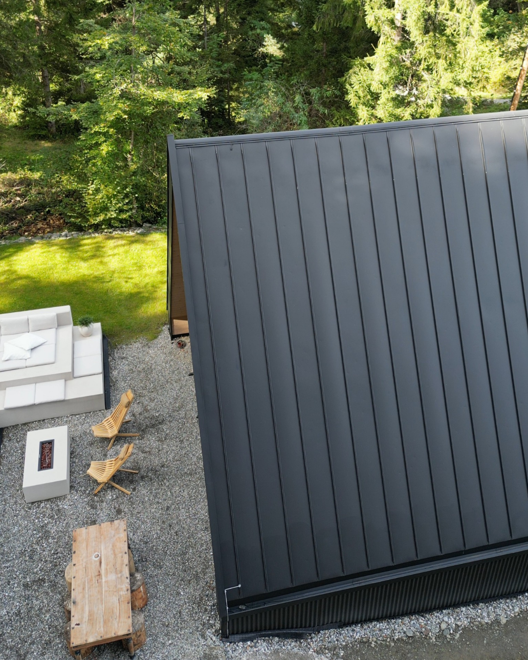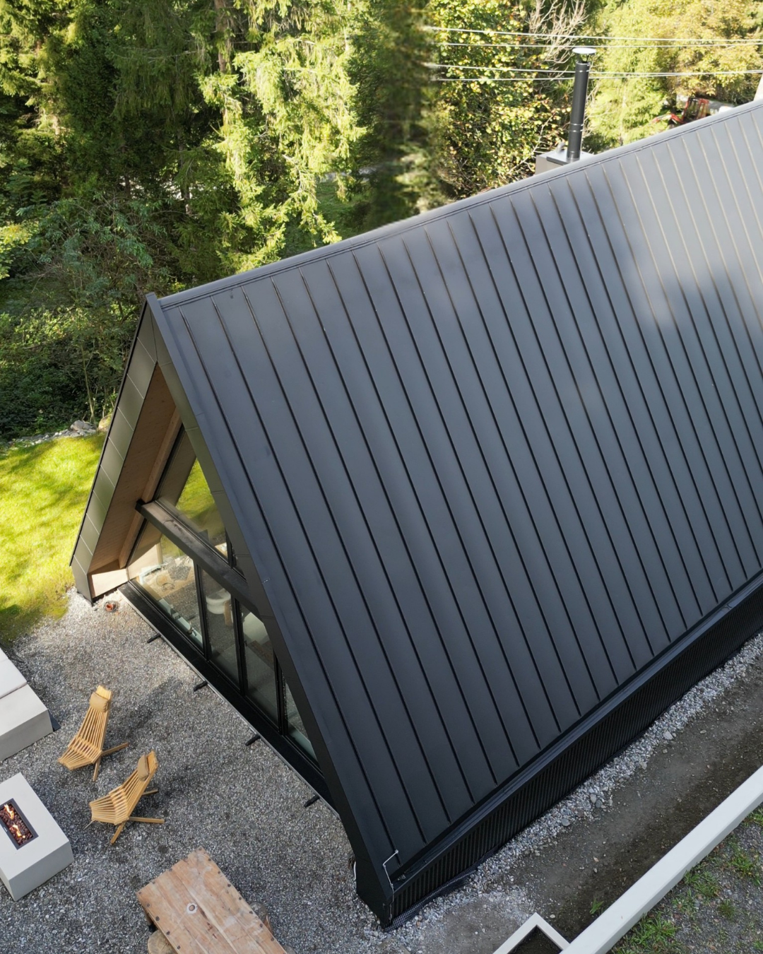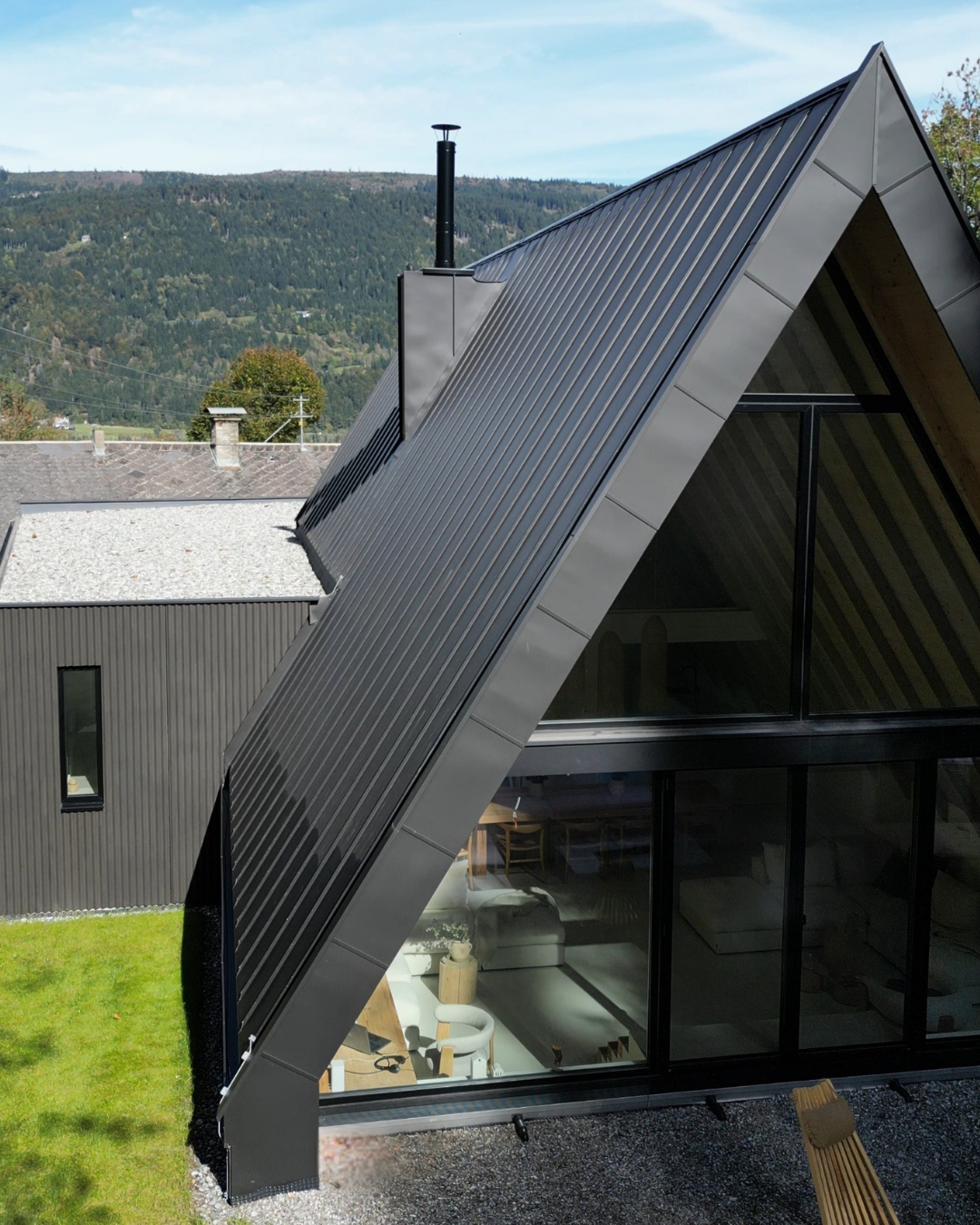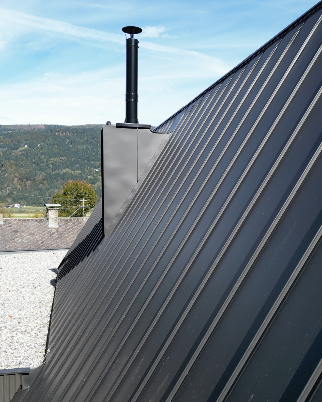 Sämtliche Verblechungen und Anschlüsse – von der Dachrinne bis zu den Giebel- und Kamindetails – wurden in Aluminium von Prefa in elegantem Schwarzgrau gefertigt. So entstand ein stimmiges Gesamtbild mit klaren Linien und einer hochwertigen, langlebigen Oberfläche.